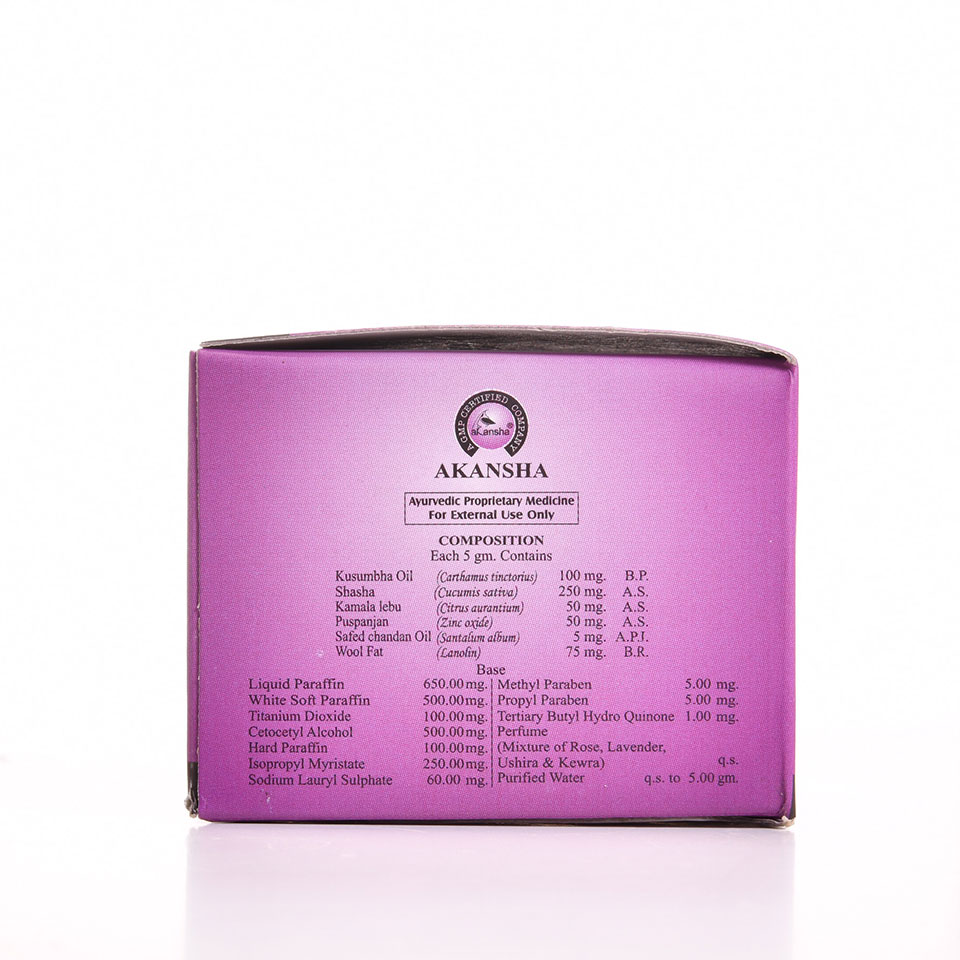 Kusumba oil(Carthamus tinctorius),Shasha(Cucumis sativa),Kamla lebu(Citrus aurantium),Puspanzan(Zinc oxide),Safed chandan oil(Santalum album),Wool fat,Liquid paraffin,White soft paraffin,Titanium Dioxide,Cetocetyl Alcohol,Hard Paraffin,Isopropyl Myristate,Sodium Lauryl Sulphate,Methyl paraben,Propyl paraben,TBHQ,Perfume(Mixture of Rosa,Lavender,Ushira &Kewra),Purified water.Recomended